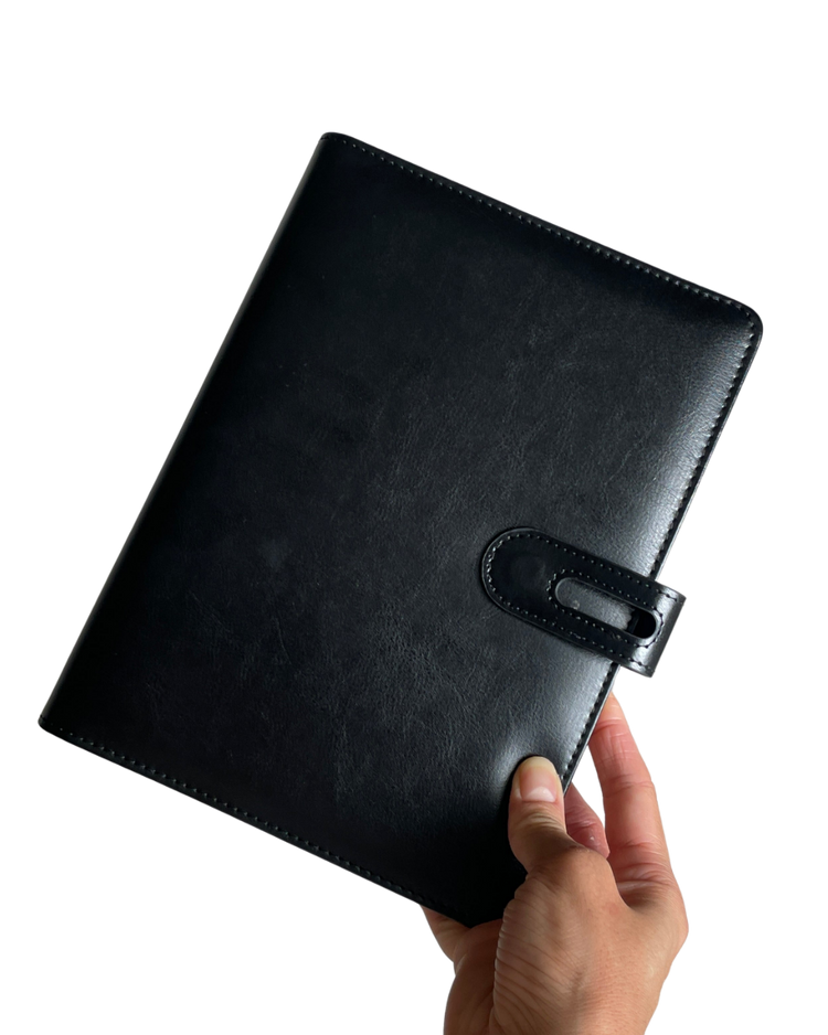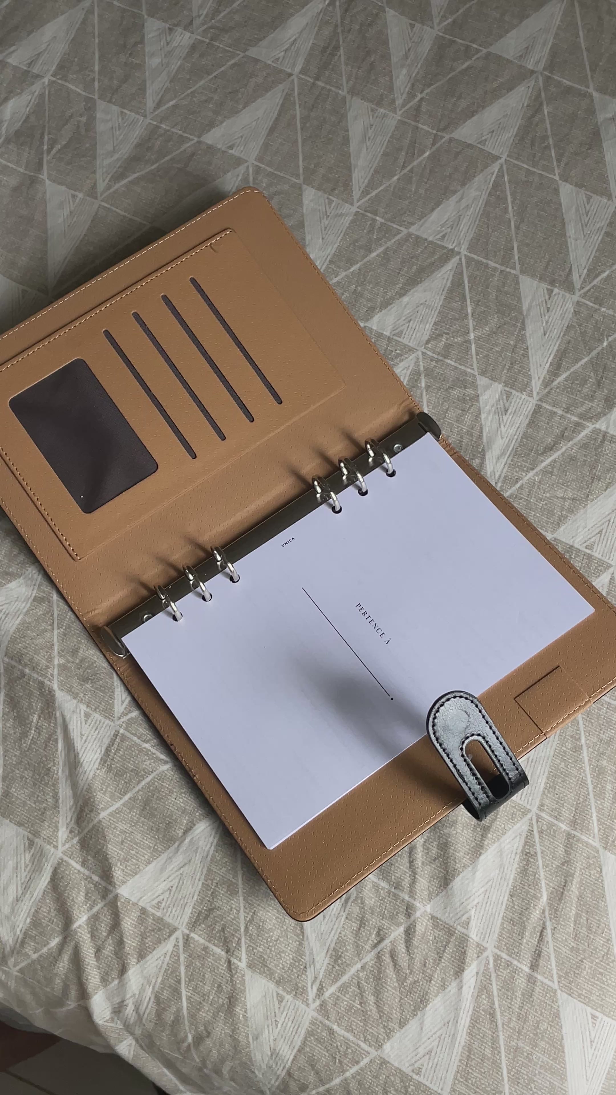 Essa case tem o argolado prata, 19mm, bolsos para cartão e 1 porta caneta.